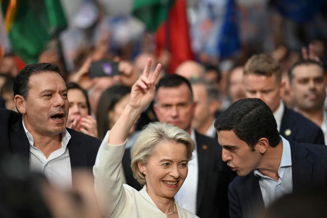 当地时候2024年6月6日,葡萄牙波尔图,欧盟委员会主席乌尔苏拉·冯德莱恩(中)、葡萄牙总理蒙特内哥罗(左)和民主定约候选东谈主塞巴斯蒂安·布加略(右)进入欧洲议会选举的竞选采集。图/视觉中国