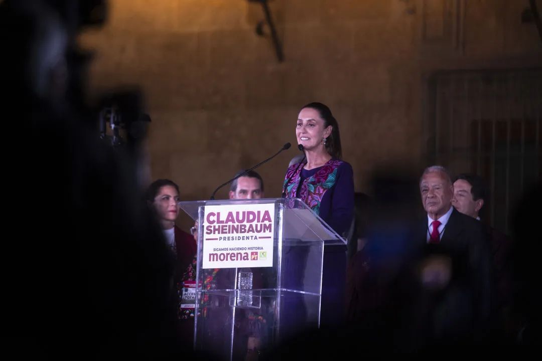 当地时候2024年6月3日凌晨,在“墨西哥万岁”的呼喊声中,提前锁定胜局的墨西哥在野党国度回应灵通党总统候选东谈主克劳迪娅·辛鲍姆在齐门墨西哥城发表胜选演讲。
