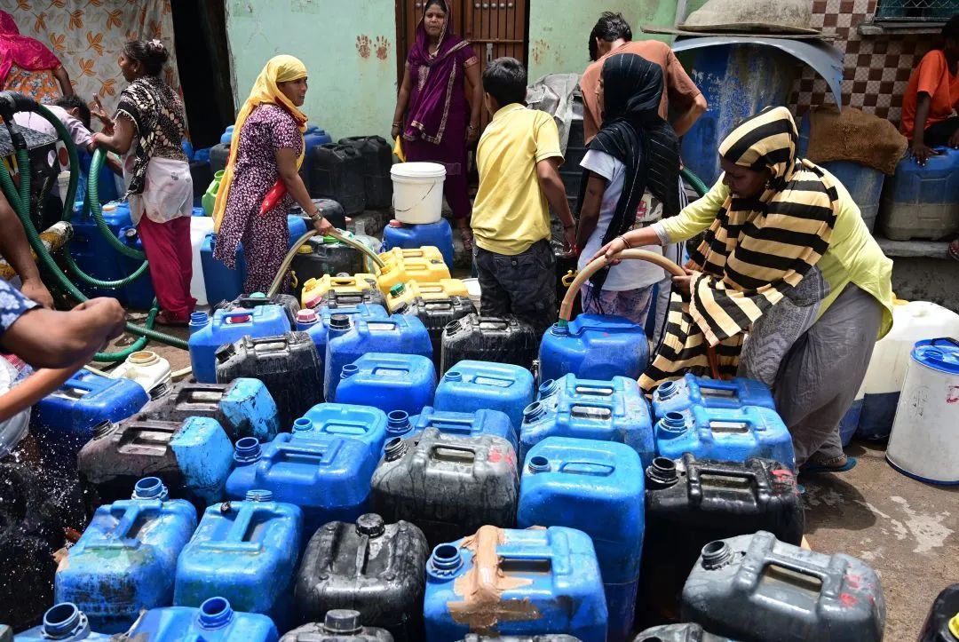 当地时候2024年6月5日,印度新德里,库苏普尔帕哈里穷人窟,全球冒着暑热从水罐车中取水。图/视觉中国