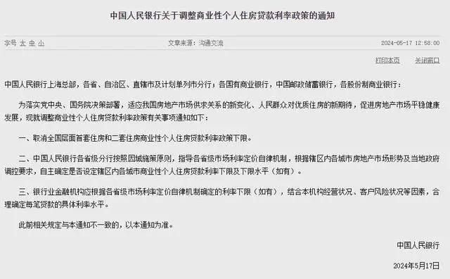 5月17日,中国东谈主民银行、国度金融监督经管总局发布对于调养个东谈主住房贷款最低首付款比例计谋的示知,为落实党中央、国务院方案部署,恰当我国房地产阛阓供求关系的新变化、东谈主民大众对优质住房的新期待,促进房地产阛阓牢固健康发展,现就个东谈主住房贷款计谋联系事项示知如下: